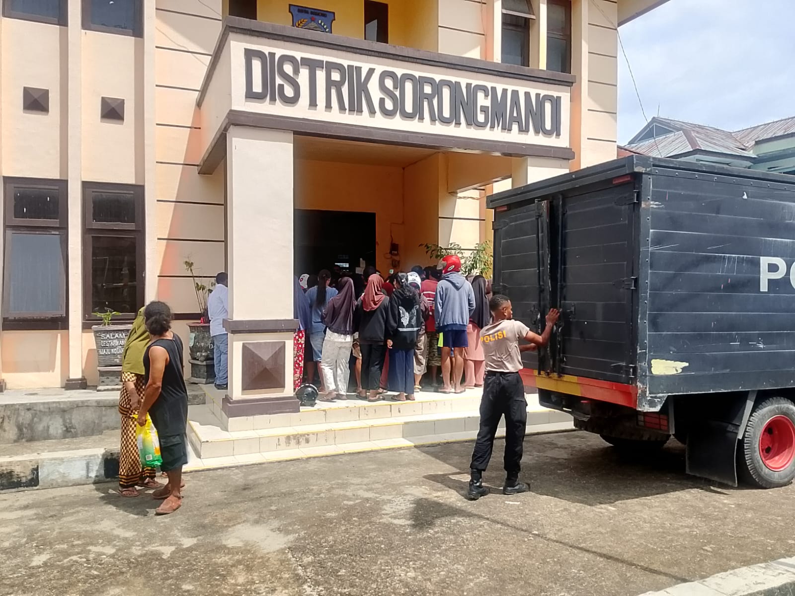 Sorong PBD– ,Halaman Kantor Distrik Sorong Manoi, Kota Sorong, Senin (11/8/2025) pagi, sekira pukul 10:00 WIT, mendadak berubah seperti pasar dadakan. Warga berbondong-bondong memadati pintu masuk utama kantor Distrik demi mendapatkan beras murah yang digelontorkan Polda Papua Barat Daya melalui program Gerakan Pangan Murah.