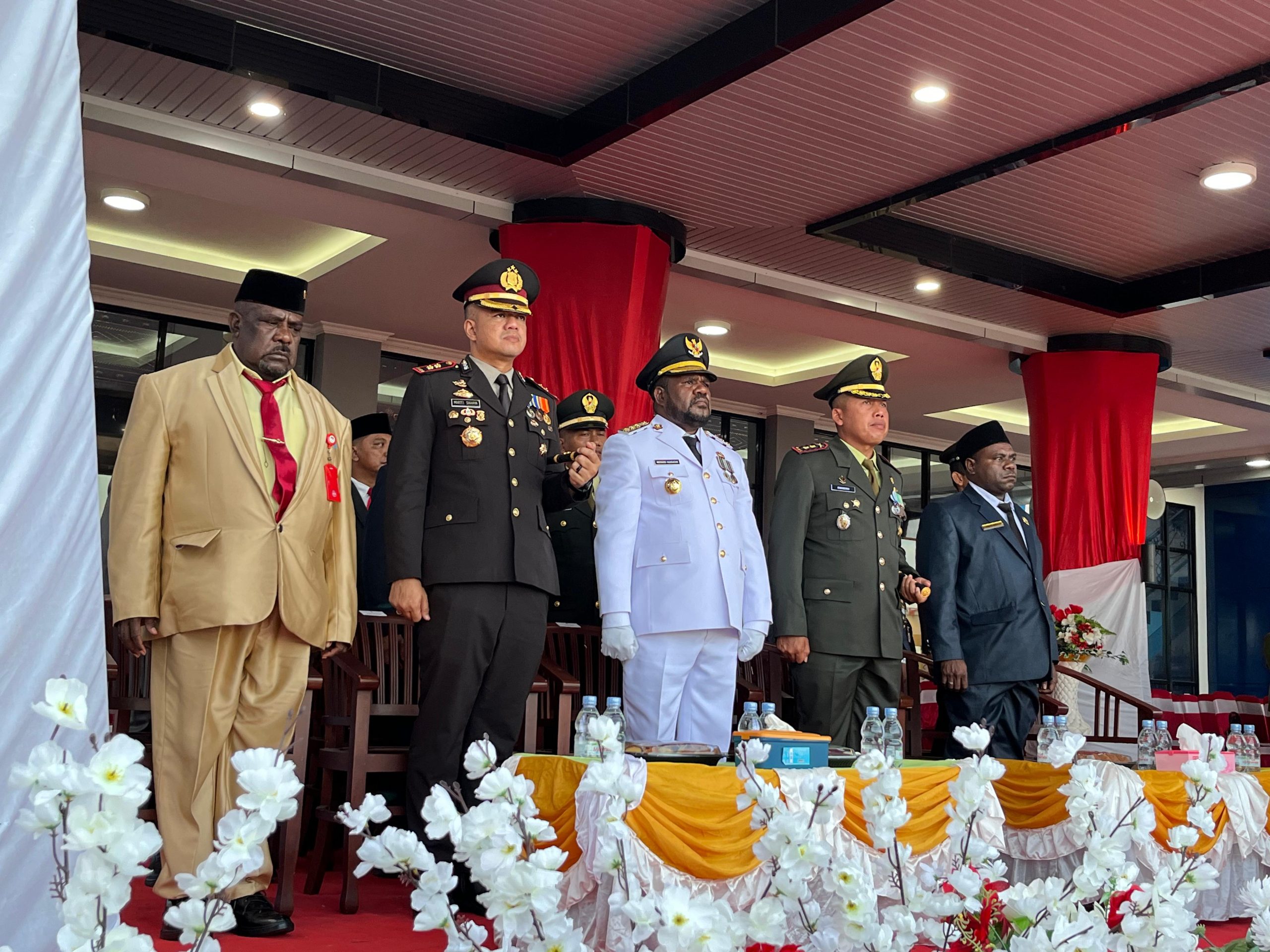 Polres Mansel- Kepala Kepolisian Resor Manokwari Selatan AKBP Marzel Doni, S.I.K., M.H. didampingi Ibu Ketua Bhayangkari Cabang Manokwari Selatan Ny. Marzel Doni menghadiri Upacara Bendera dalam rangka memperingati Hari Kemerdekaan Republik Indonesia ke-80 di Halaman Kantor Bupati yang berlokasi di Bukit Boako Distrik Ransiki Kabupaten Manokwari Selatan. Minggu, (17/8/2025)